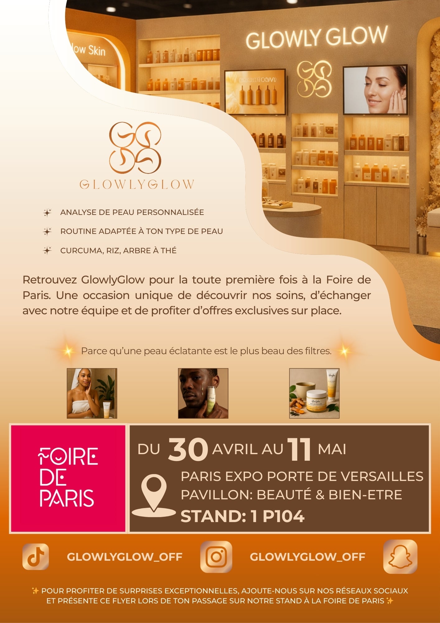 Lors de nos événements, on échange, on analyse votre peau sur place et on vous guide vers la routine qui vous correspond. Venez vivre l’expérience GlowlyGlow avec nous.